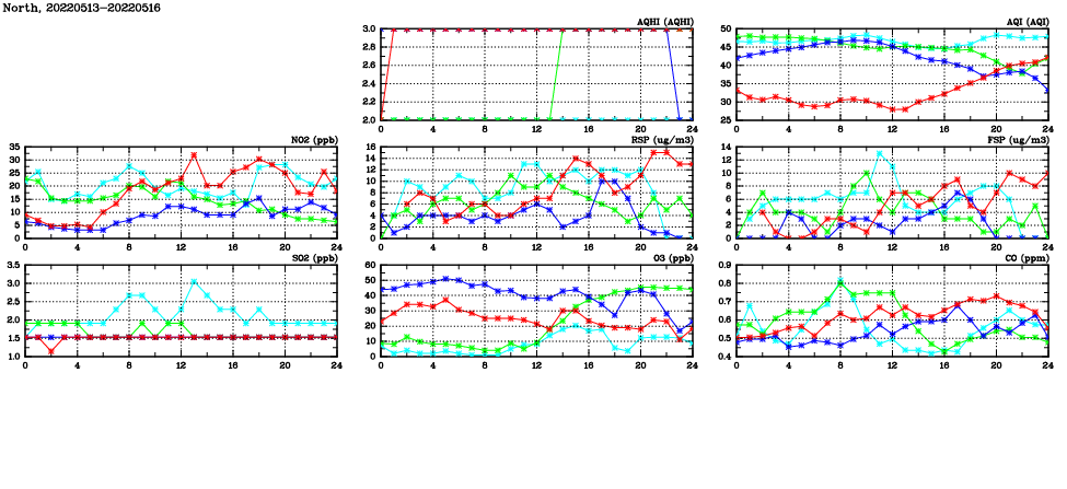 | Air Quality Data Time Series in North (2022/05/16) | ( Line colors: Day -3 Day -2 Day -1 Current day ) | 2D Map Current AQHI |