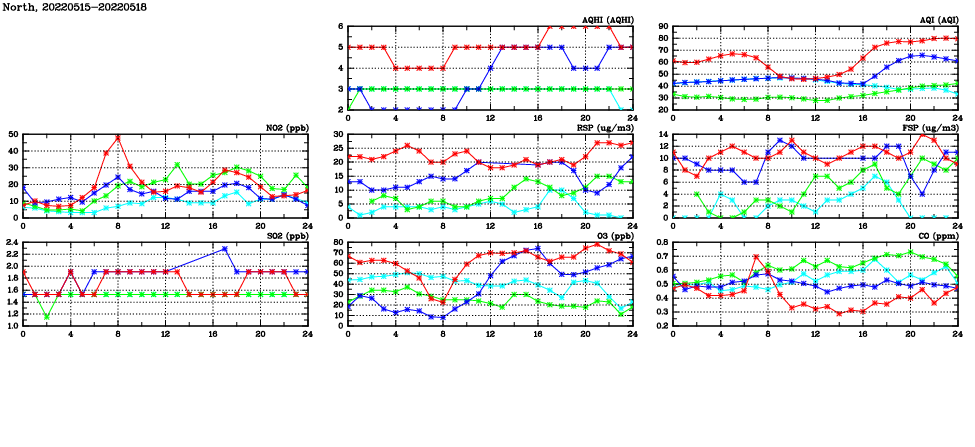 | Air Quality Data Time Series in North (2022/05/18) | ( Line colors: Day -3 Day -2 Day -1 Current day ) | 2D Map Current AQHI |