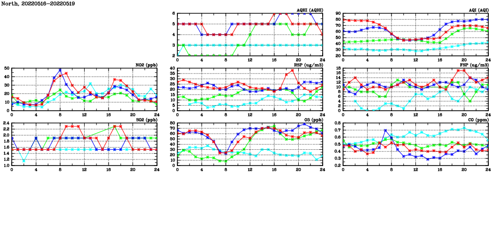 | Air Quality Data Time Series in North (2022/05/19) | ( Line colors: Day -3 Day -2 Day -1 Current day ) | 2D Map Current AQHI |