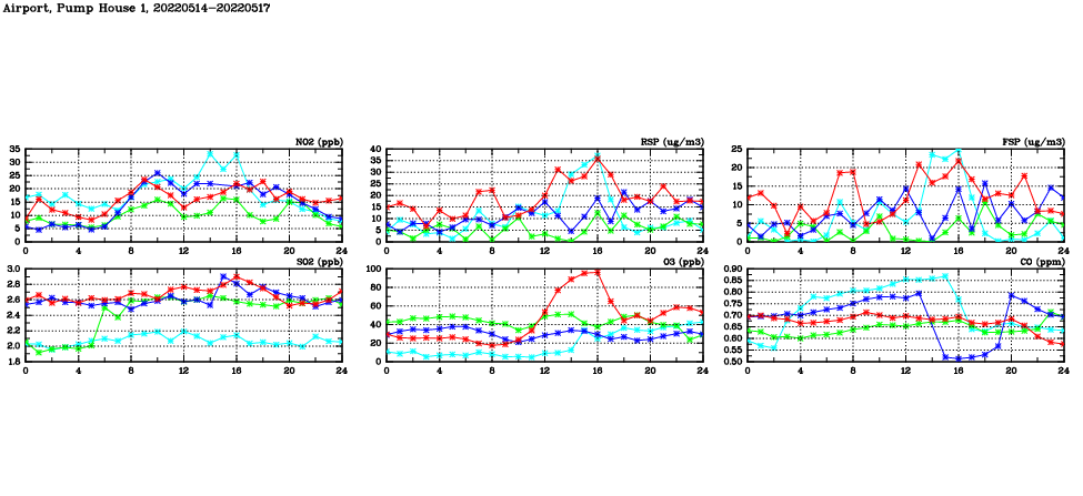 | Air Quality Data Time Series in Airport, Pump House 1 (2022/05/17) | ( Line colors: Day -3 Day -2 Day -1 Current day ) | 2D Map Current AQHI |