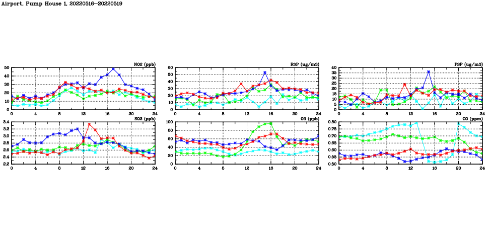 | Air Quality Data Time Series in Airport, Pump House 1 (2022/05/19) | ( Line colors: Day -3 Day -2 Day -1 Current day ) | 2D Map Current AQHI |