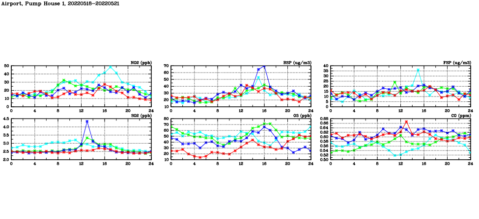 | Air Quality Data Time Series in Airport, Pump House 1 (2022/05/21) | ( Line colors: Day -3 Day -2 Day -1 Current day ) | 2D Map Current AQHI |