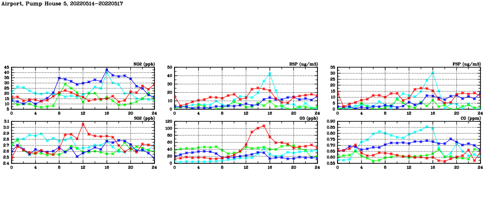 | Air Quality Data Time Series in Airport, Pump House 5 (2022/05/17) | ( Line colors: Day -3 Day -2 Day -1 Current day ) | 2D Map Current AQHI |