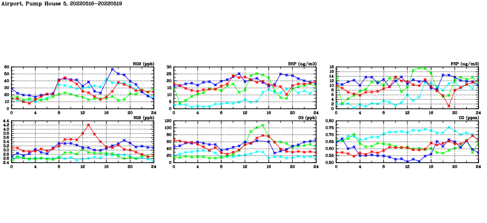 | Air Quality Data Time Series in Airport, Pump House 5 (2022/05/19) | ( Line colors: Day -3 Day -2 Day -1 Current day ) | 2D Map Current AQHI |