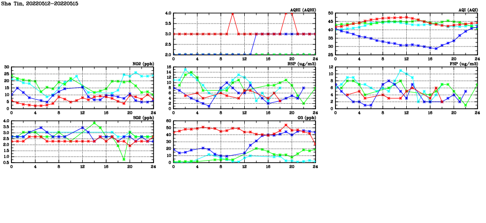 | Air Quality Data Time Series in Sha Tin (2022/05/15) | ( Line colors: Day -3 Day -2 Day -1 Current day ) | 2D Map Current AQHI |