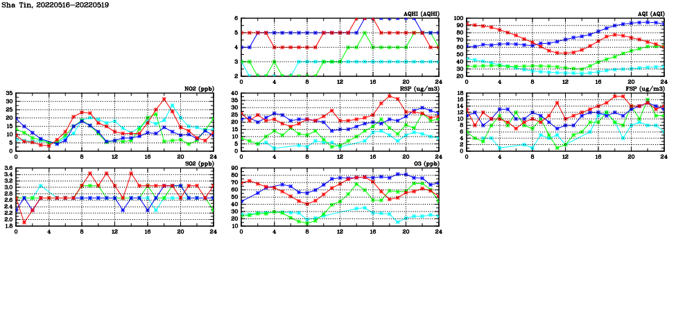 | Air Quality Data Time Series in Sha Tin (2022/05/19) | ( Line colors: Day -3 Day -2 Day -1 Current day ) | 2D Map Current AQHI |