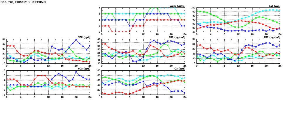 | Air Quality Data Time Series in Sha Tin (2022/05/21) | ( Line colors: Day -3 Day -2 Day -1 Current day ) | 2D Map Current AQHI |