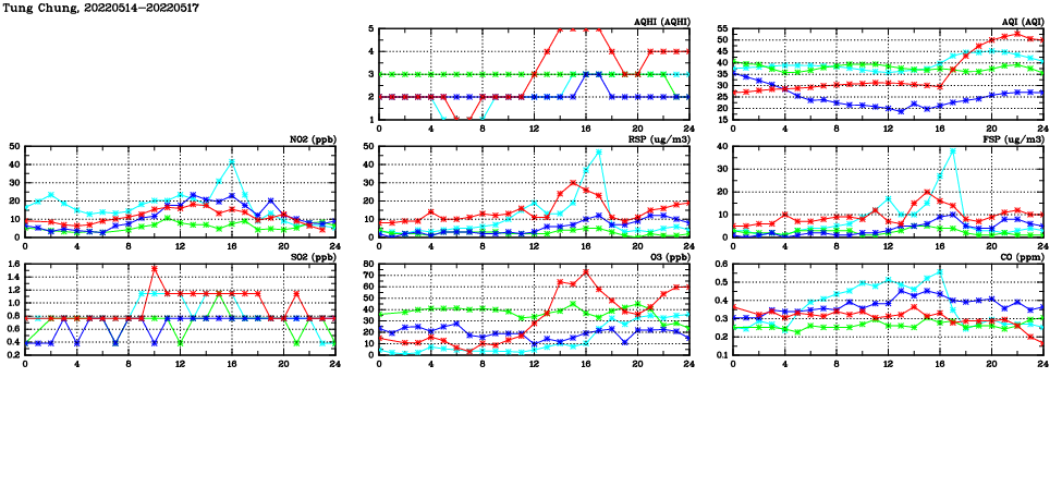 | Air Quality Data Time Series in Tung Chung (2022/05/17) | ( Line colors: Day -3 Day -2 Day -1 Current day ) | 2D Map Current AQHI |
