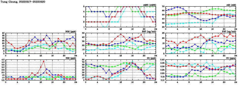 | Air Quality Data Time Series in Tung Chung (2022/05/20) | ( Line colors: Day -3 Day -2 Day -1 Current day ) | 2D Map Current AQHI |