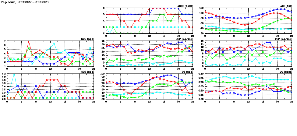 | Air Quality Data Time Series in Tap Mun (2022/05/19) | ( Line colors: Day -3 Day -2 Day -1 Current day ) | 2D Map Current AQHI |