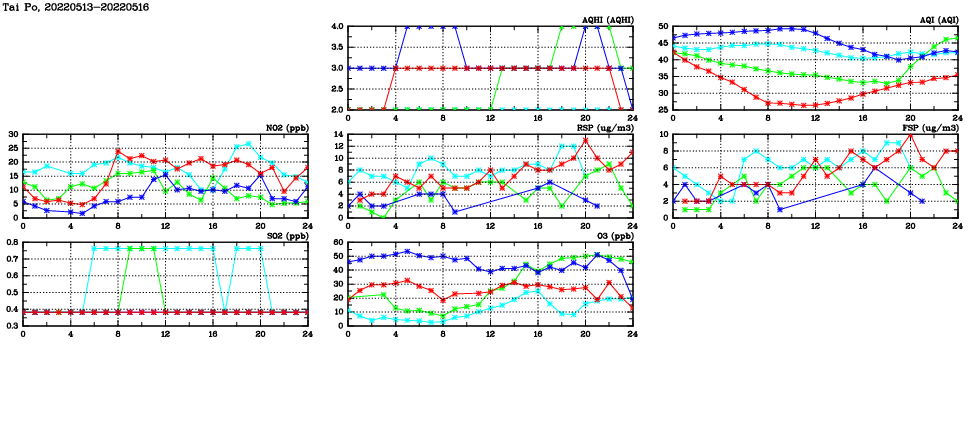 | Air Quality Data Time Series in Tai Po (2022/05/16) | ( Line colors: Day -3 Day -2 Day -1 Current day ) | 2D Map Current AQHI |