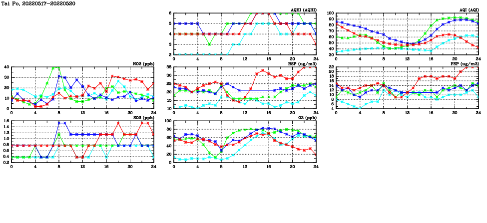 | Air Quality Data Time Series in Tai Po (2022/05/20) | ( Line colors: Day -3 Day -2 Day -1 Current day ) | 2D Map Current AQHI |