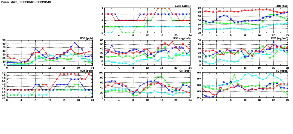 | Air Quality Data Time Series in Tuen Mun (2022/05/19) | ( Line colors: Day -3 Day -2 Day -1 Current day ) | 2D Map Current AQHI |