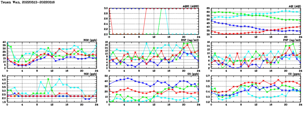 | Air Quality Data Time Series in Tsuen Wan (2022/05/16) | ( Line colors: Day -3 Day -2 Day -1 Current day ) | 2D Map Current AQHI |