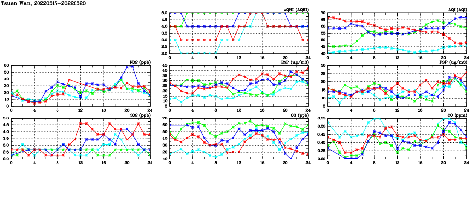 | Air Quality Data Time Series in Tsuen Wan (2022/05/20) | ( Line colors: Day -3 Day -2 Day -1 Current day ) | 2D Map Current AQHI |