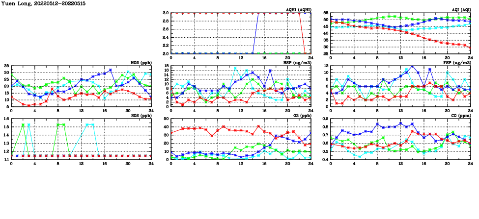 | Air Quality Data Time Series in Yuen Long (2022/05/15) | ( Line colors: Day -3 Day -2 Day -1 Current day ) | 2D Map Current AQHI |