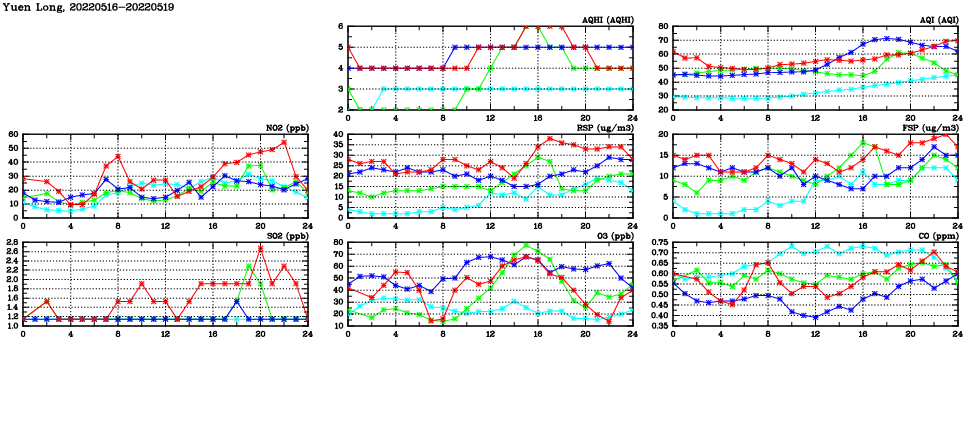 | Air Quality Data Time Series in Yuen Long (2022/05/19) | ( Line colors: Day -3 Day -2 Day -1 Current day ) | 2D Map Current AQHI |