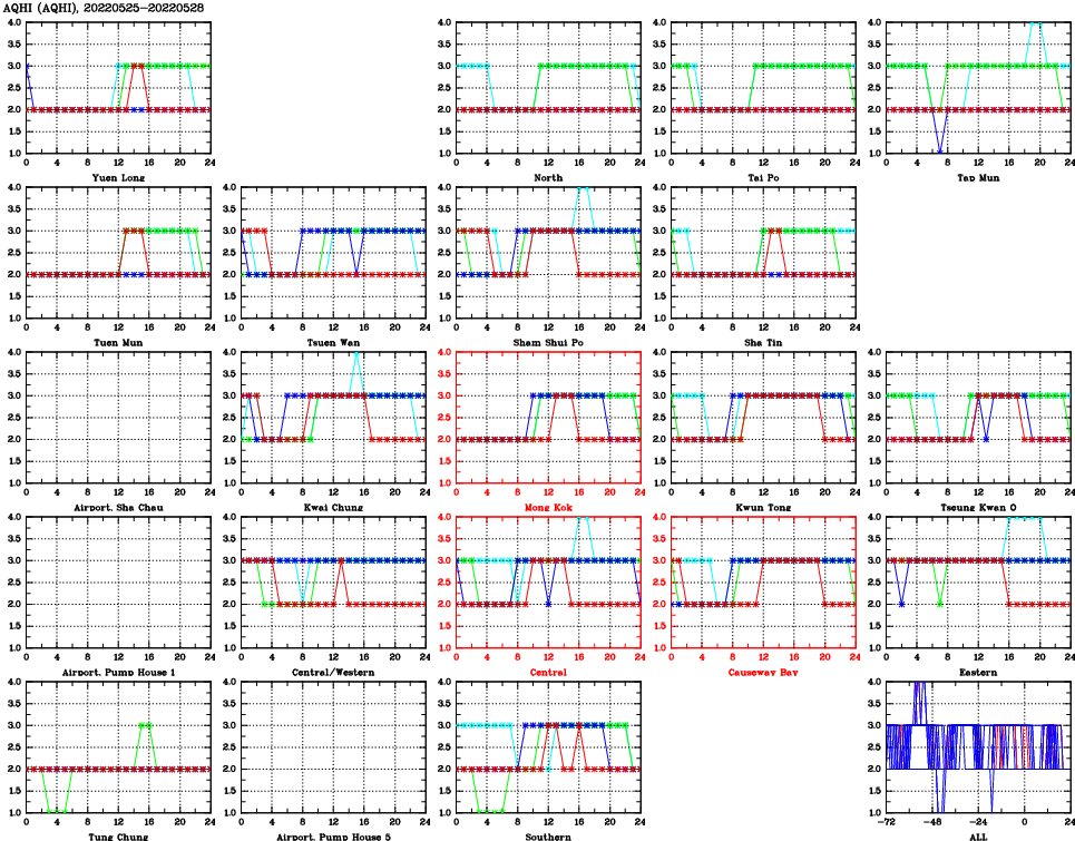 | Air Quality Data Time Series for AQHI (2022/05/28) | ( Line colors: Day -3 Day -2 Day -1 Current day ) | 2D Map Current AQHI |