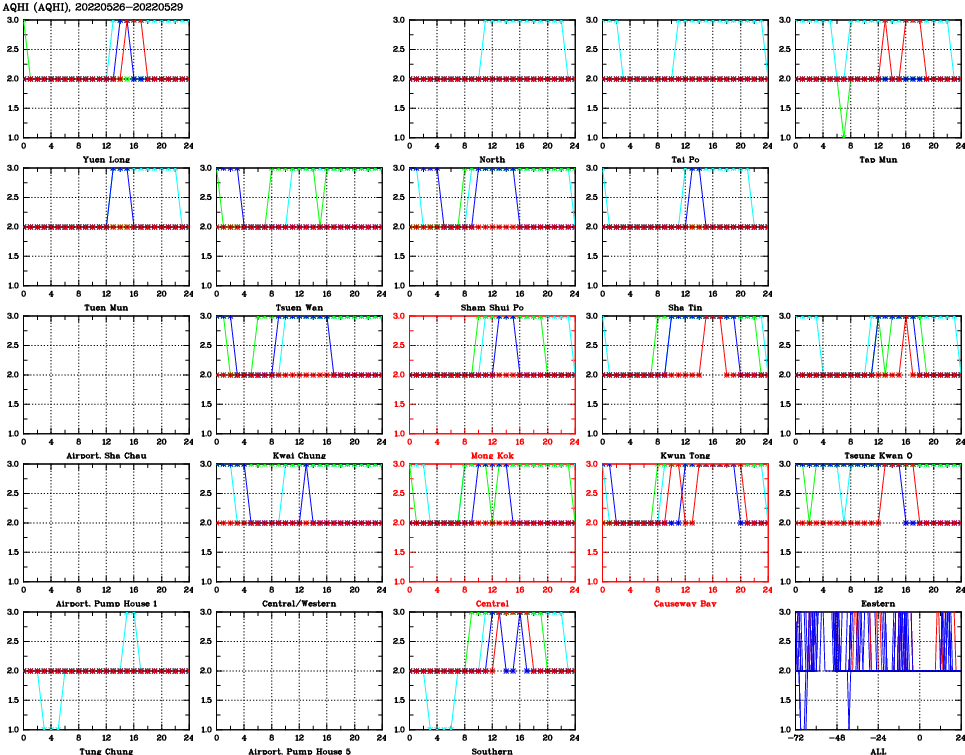 | Air Quality Data Time Series for AQHI (2022/05/29) | ( Line colors: Day -3 Day -2 Day -1 Current day ) | 2D Map Current AQHI |