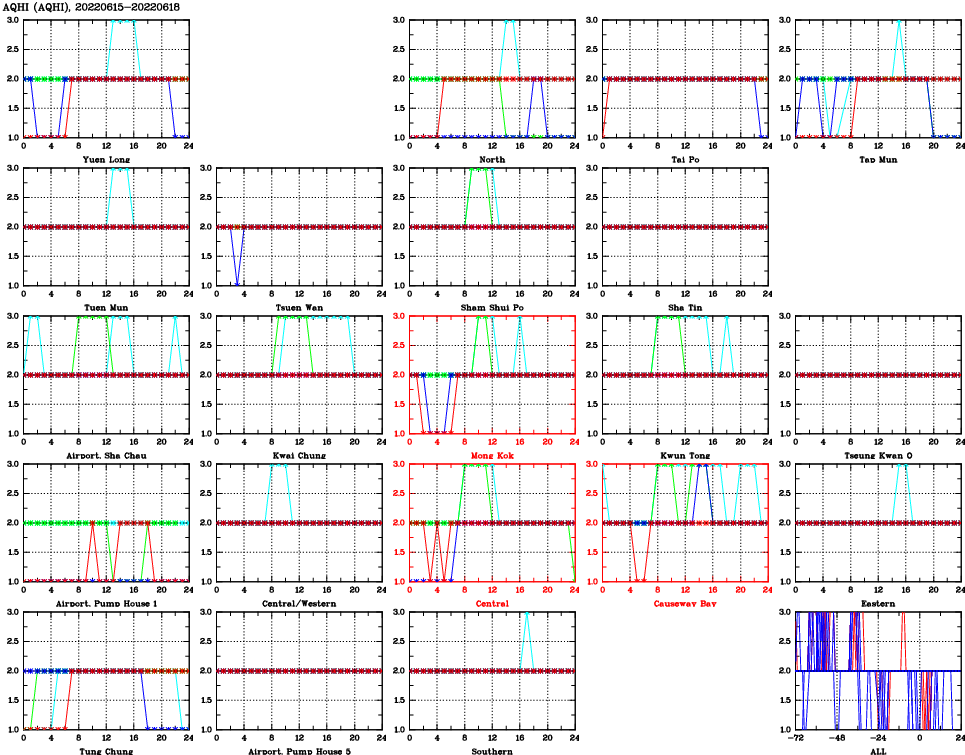 | Air Quality Data Time Series for AQHI (2022/06/18) | ( Line colors: Day -3 Day -2 Day -1 Current day ) | 2D Map Current AQHI |
