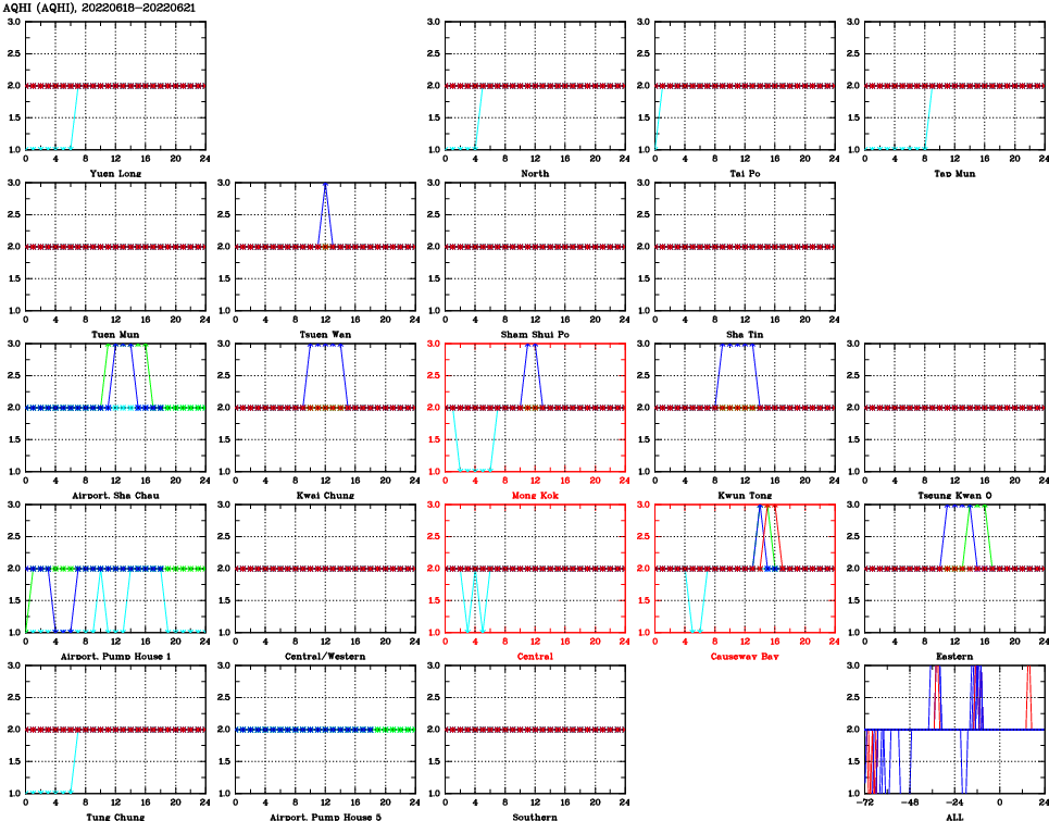 | Air Quality Data Time Series for AQHI (2022/06/21) | ( Line colors: Day -3 Day -2 Day -1 Current day ) | 2D Map Current AQHI |