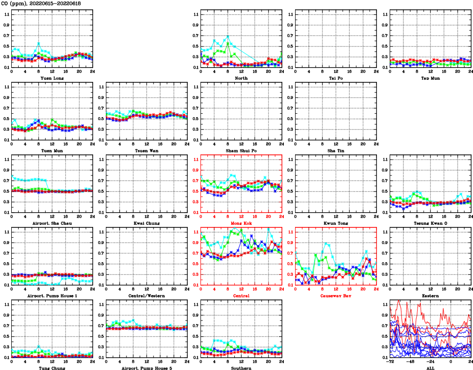 | Air Quality Data Time Series for CO (2022/06/18) | ( Line colors: Day -3 Day -2 Day -1 Current day ) | 2D Map Current AQHI |