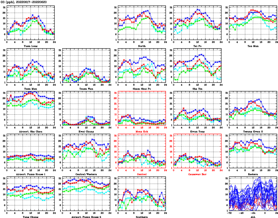 | Air Quality Data Time Series for O3 (2022/06/20) | ( Line colors: Day -3 Day -2 Day -1 Current day ) | 2D Map Current AQHI |