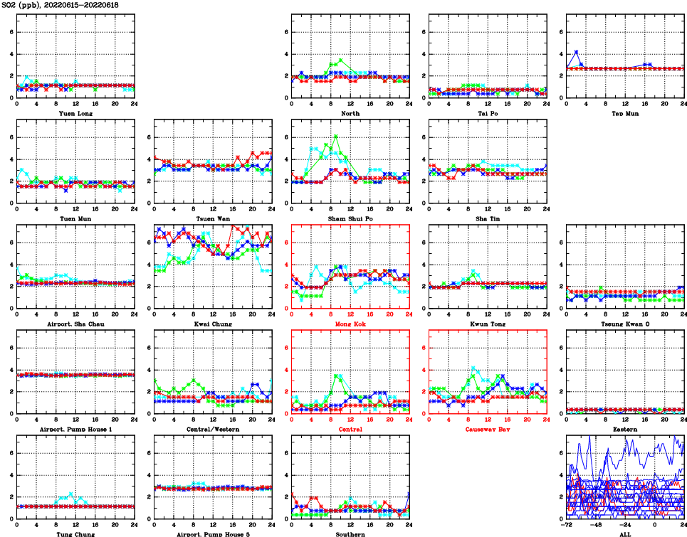 | Air Quality Data Time Series for SO2 (2022/06/18) | ( Line colors: Day -3 Day -2 Day -1 Current day ) | 2D Map Current AQHI |