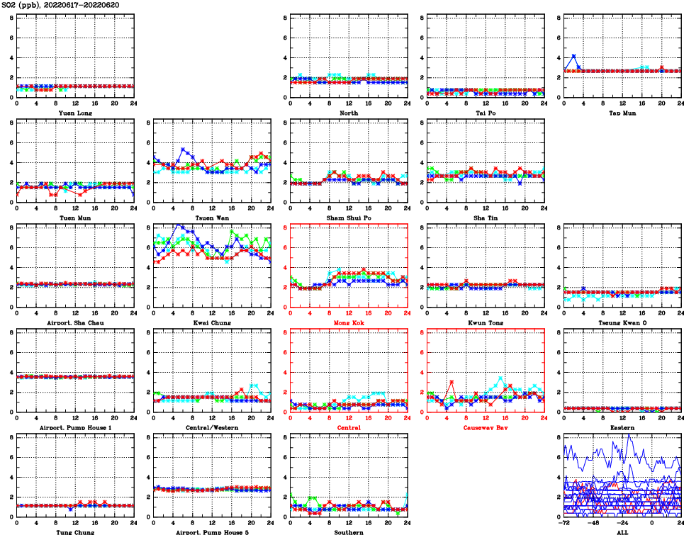 | Air Quality Data Time Series for SO2 (2022/06/20) | ( Line colors: Day -3 Day -2 Day -1 Current day ) | 2D Map Current AQHI |
