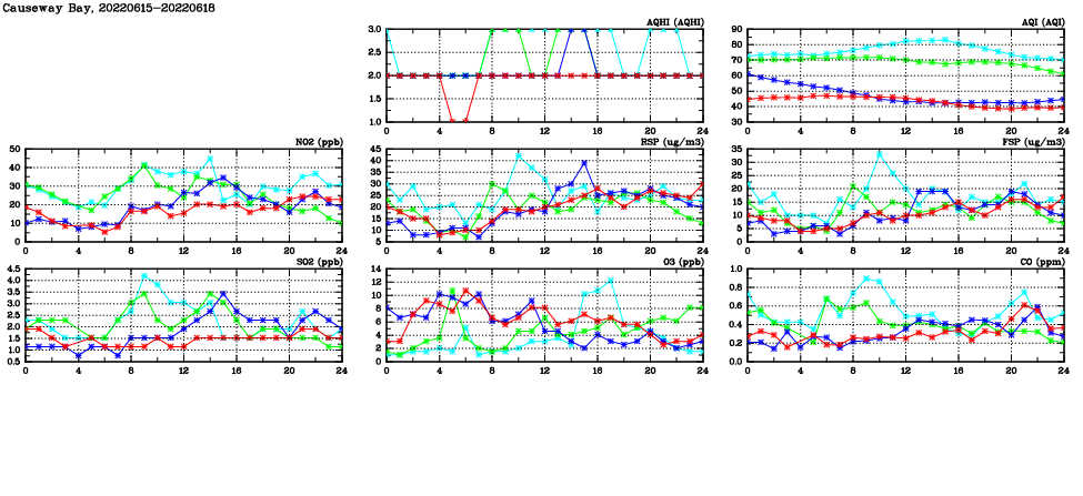 | Air Quality Data Time Series in Causeway Bay (2022/06/18) | ( Line colors: Day -3 Day -2 Day -1 Current day ) | 2D Map Current AQHI |