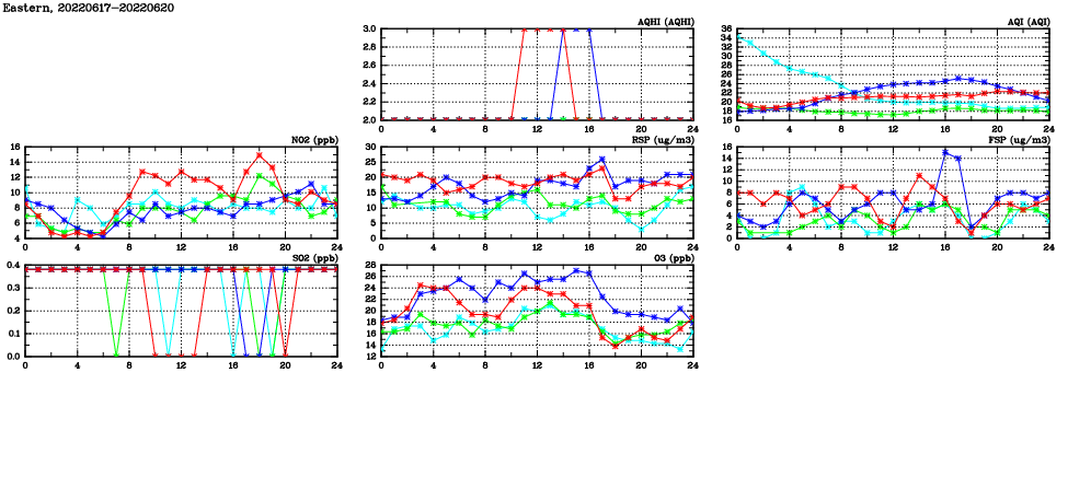 | Air Quality Data Time Series in Eastern (2022/06/20) | ( Line colors: Day -3 Day -2 Day -1 Current day ) | 2D Map Current AQHI |