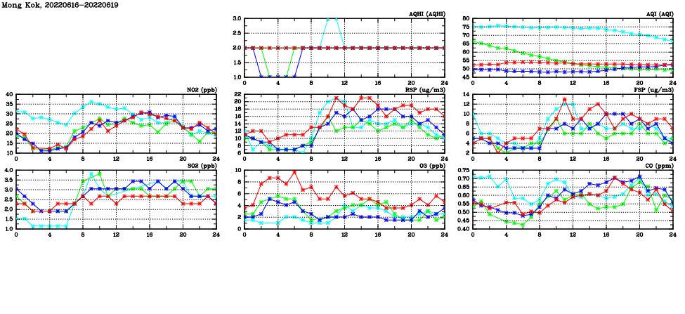 | Air Quality Data Time Series in Mong Kok (2022/06/19) | ( Line colors: Day -3 Day -2 Day -1 Current day ) | 2D Map Current AQHI |