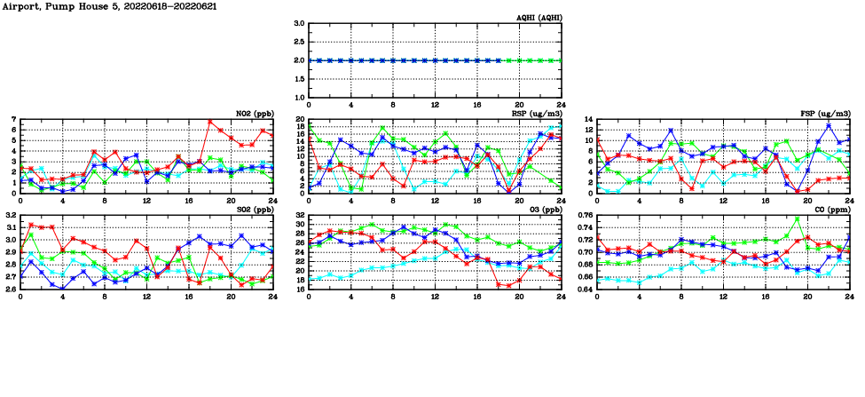 | Air Quality Data Time Series in Airport, Pump House 5 (2022/06/21) | ( Line colors: Day -3 Day -2 Day -1 Current day ) | 2D Map Current AQHI |