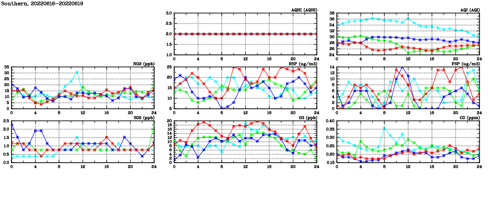 | Air Quality Data Time Series in Southern (2022/06/19) | ( Line colors: Day -3 Day -2 Day -1 Current day ) | 2D Map Current AQHI |