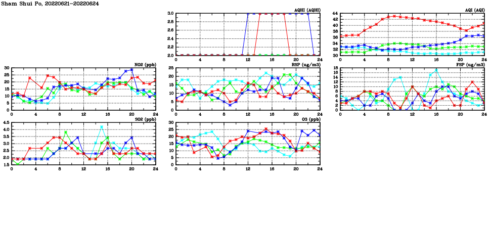 | Air Quality Data Time Series in Sham Shui Po (2022/06/24) | ( Line colors: Day -3 Day -2 Day -1 Current day ) | 2D Map Current AQHI |