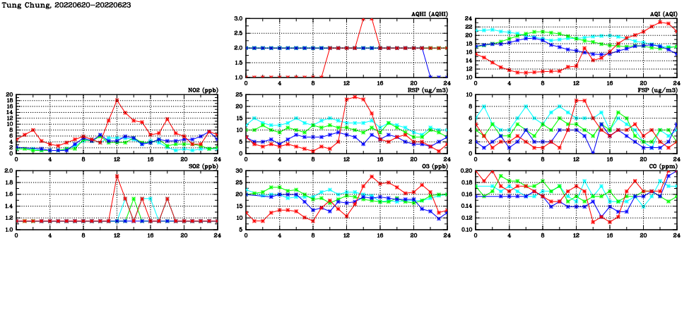 | Air Quality Data Time Series in Tung Chung (2022/06/23) | ( Line colors: Day -3 Day -2 Day -1 Current day ) | 2D Map Current AQHI |