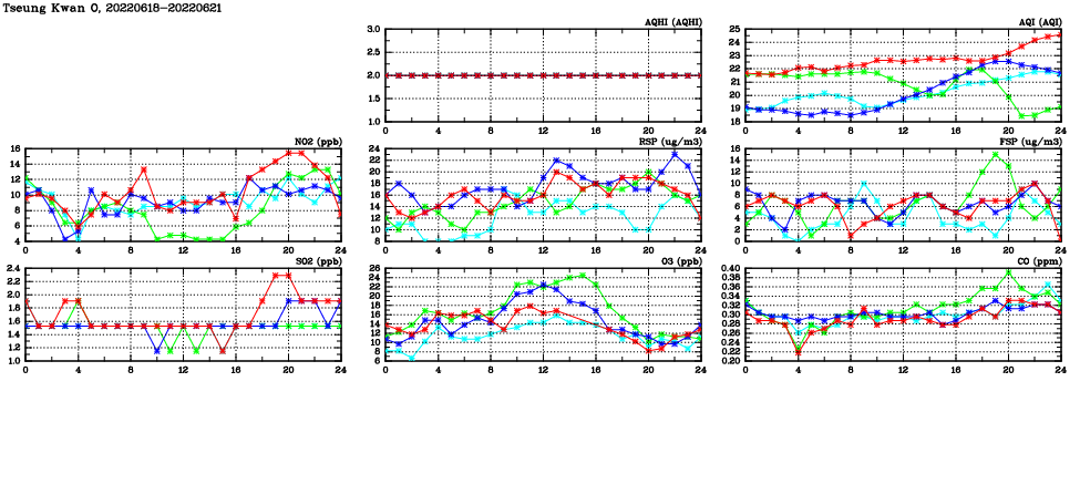 | Air Quality Data Time Series in Tseung Kwan O (2022/06/21) | ( Line colors: Day -3 Day -2 Day -1 Current day ) | 2D Map Current AQHI |