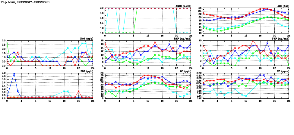 | Air Quality Data Time Series in Tap Mun (2022/06/20) | ( Line colors: Day -3 Day -2 Day -1 Current day ) | 2D Map Current AQHI |