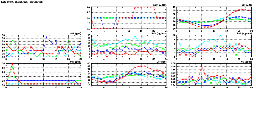 | Air Quality Data Time Series in Tap Mun (2022/06/23) | ( Line colors: Day -3 Day -2 Day -1 Current day ) | 2D Map Current AQHI |