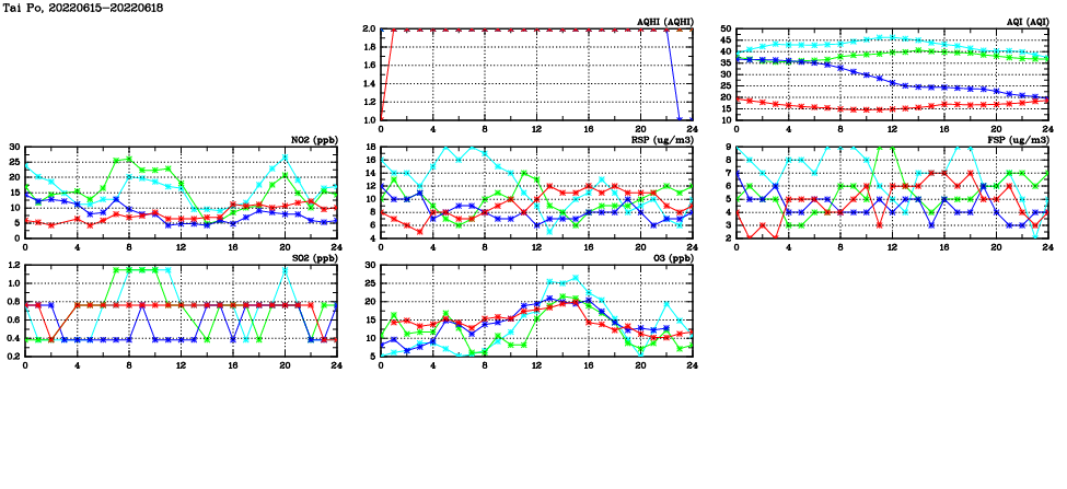 | Air Quality Data Time Series in Tai Po (2022/06/18) | ( Line colors: Day -3 Day -2 Day -1 Current day ) | 2D Map Current AQHI |
