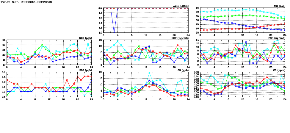 | Air Quality Data Time Series in Tsuen Wan (2022/06/18) | ( Line colors: Day -3 Day -2 Day -1 Current day ) | 2D Map Current AQHI |