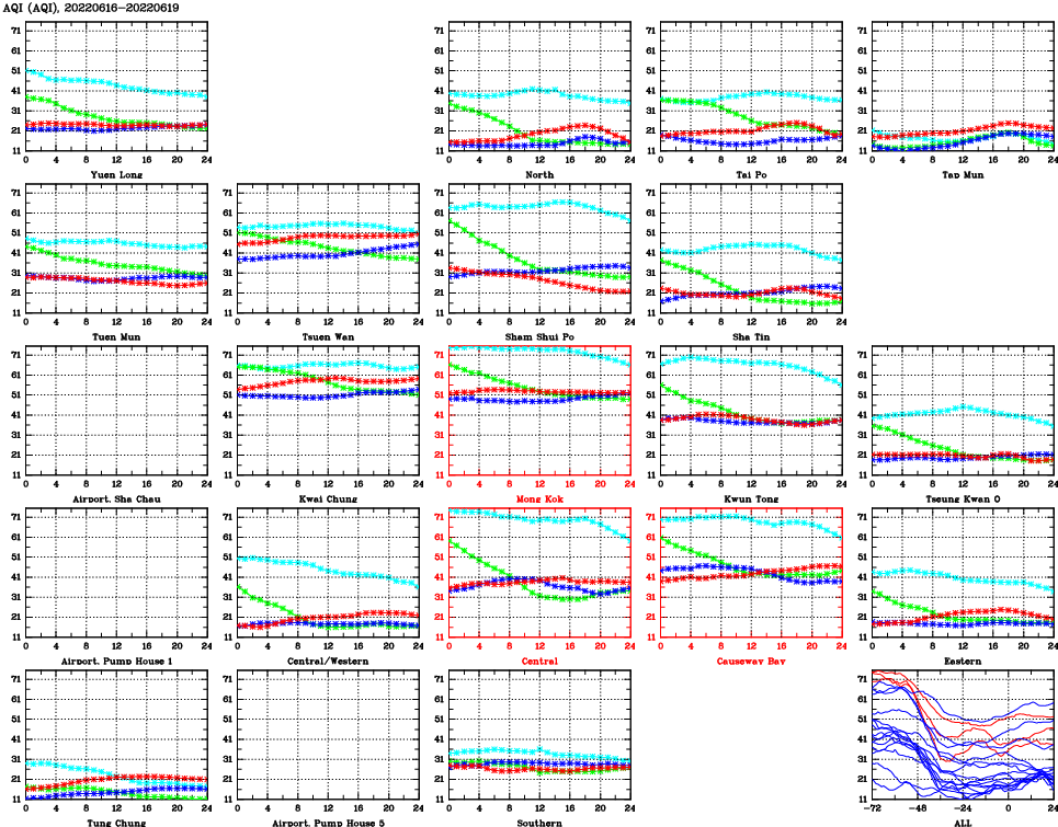 | Air Quality Data Time Series for AQI (2022/06/19) | ( Line colors: Day -3 Day -2 Day -1 Current day ) | 2D Map Current AQHI |