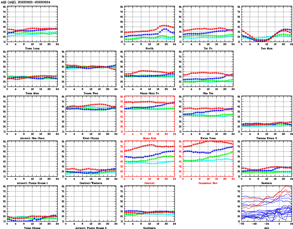 | Air Quality Data Time Series for AQI (2022/06/24) | ( Line colors: Day -3 Day -2 Day -1 Current day ) | 2D Map Current AQHI |