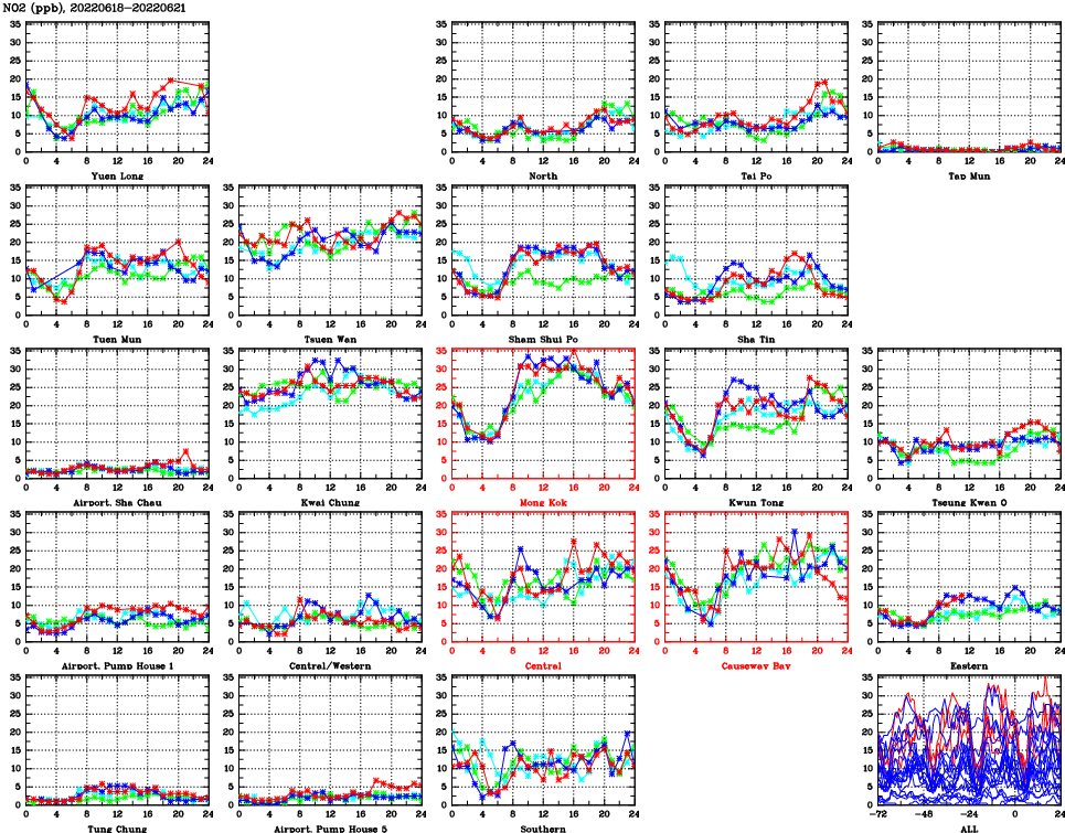 | Air Quality Data Time Series for NO2 (2022/06/21) | ( Line colors: Day -3 Day -2 Day -1 Current day ) | 2D Map Current AQHI |