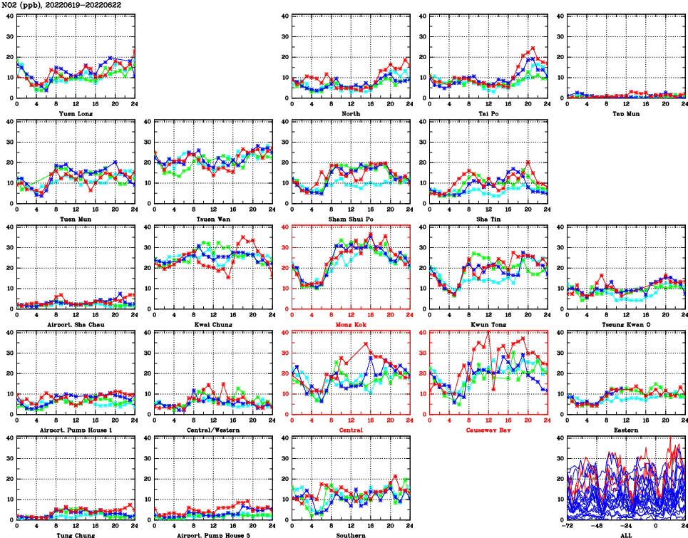 | Air Quality Data Time Series for NO2 (2022/06/22) | ( Line colors: Day -3 Day -2 Day -1 Current day ) | 2D Map Current AQHI |
