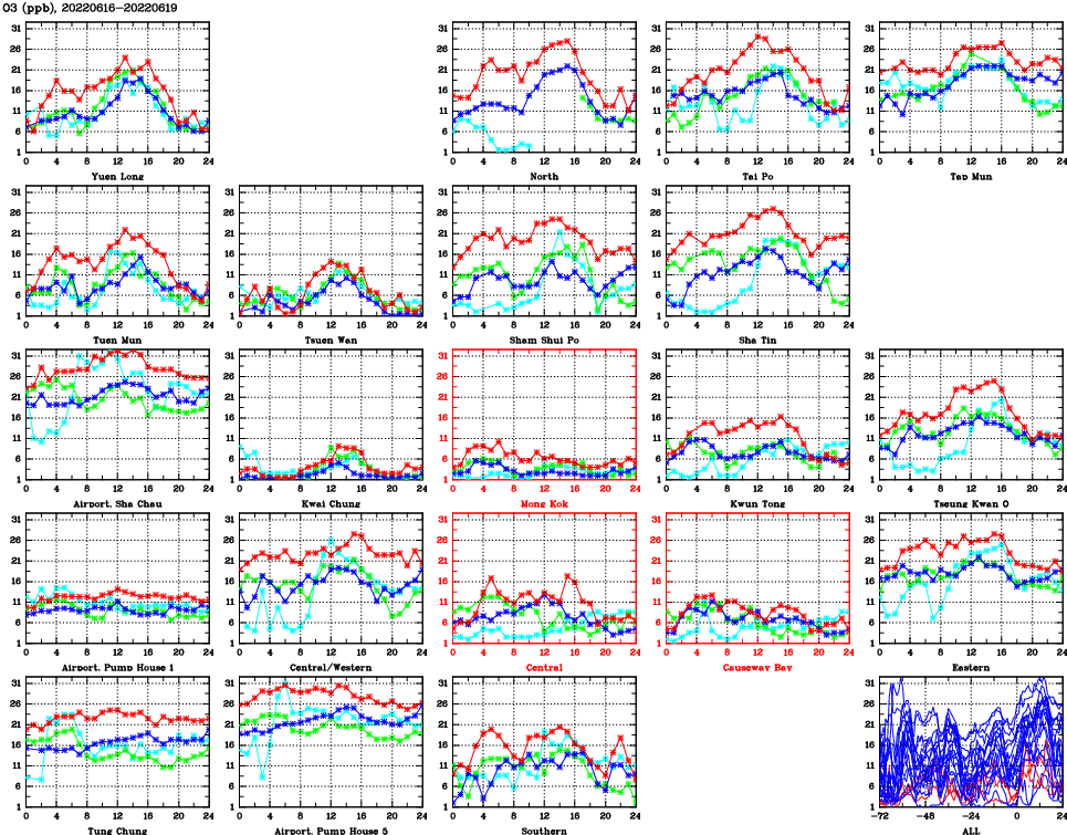 | Air Quality Data Time Series for O3 (2022/06/19) | ( Line colors: Day -3 Day -2 Day -1 Current day ) | 2D Map Current AQHI |