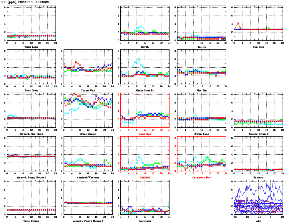 | Air Quality Data Time Series for SO2 (2022/06/19) | ( Line colors: Day -3 Day -2 Day -1 Current day ) | 2D Map Current AQHI |