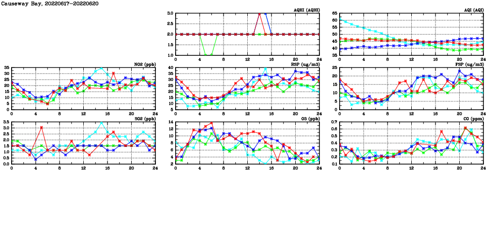 | Air Quality Data Time Series in Causeway Bay (2022/06/20) | ( Line colors: Day -3 Day -2 Day -1 Current day ) | 2D Map Current AQHI |