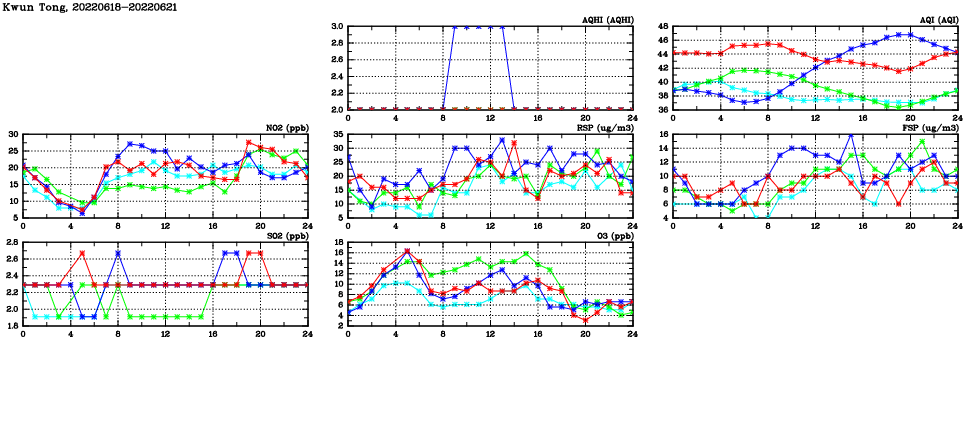 | Air Quality Data Time Series in Kwun Tong (2022/06/21) | ( Line colors: Day -3 Day -2 Day -1 Current day ) | 2D Map Current AQHI |