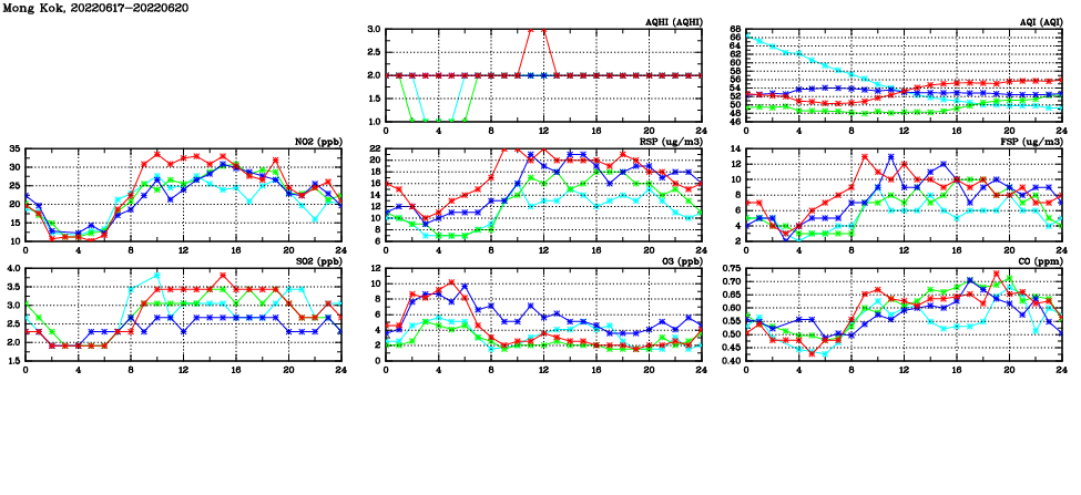 | Air Quality Data Time Series in Mong Kok (2022/06/20) | ( Line colors: Day -3 Day -2 Day -1 Current day ) | 2D Map Current AQHI |
